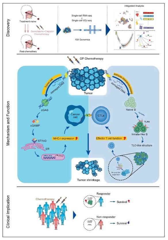 該研究發(fā)現(xiàn),GP化療介導(dǎo)的腫瘤細(xì)胞DNA片段釋放可通過Toll-like receptor 9(TLR9)信號誘導(dǎo)CD27+IgD+IgM+先天樣B細(xì)胞亞群(innate-like B cell, ILB),該亞群定位于化療誘導(dǎo)的類三級淋巴樣結(jié)構(gòu)中,通過ICOSL-ICOS信號軸促進(jìn)I型輔助性T細(xì)胞(TH1)和濾泡輔助性T細(xì)胞(TFH)的擴增,進(jìn)而促進(jìn)細(xì)胞毒性CD8+ T細(xì)胞(Cytotoxic T Lymphocyte, CTL)的殺傷功能;與此同時,其還可激活腫瘤細(xì)胞的STING-type-I-interferon通路,進(jìn)而上調(diào)腫瘤細(xì)胞主要組織相容性復(fù)合體(major histocompatibility complex, MHC)class I的表達(dá)。二者形成環(huán)路,最終,激活的免疫系統(tǒng)有效識別和殺傷鼻咽癌細(xì)胞。這項研究闡明了化療免疫調(diào)節(jié)作用的新機制,提出了以B細(xì)胞為核心的抗腫瘤免疫網(wǎng)絡(luò)新理論,研究結(jié)果將為建立鼻咽癌化療聯(lián)合免疫治療新策略提供重要理論依據(jù)。