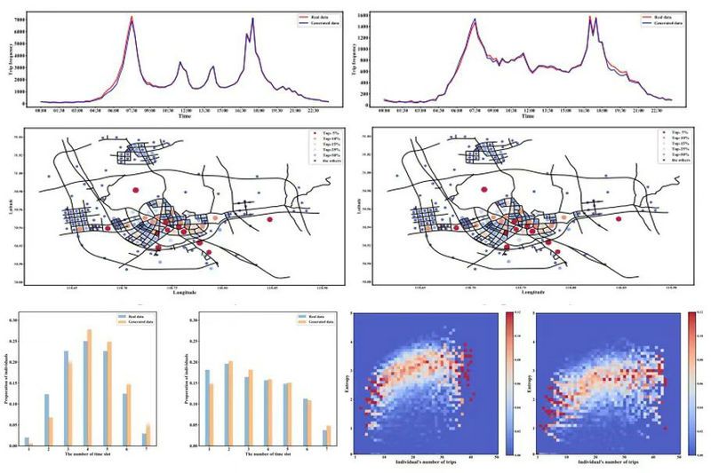 大量對(duì)比實(shí)驗(yàn)表明,生成數(shù)據(jù)集在宏觀出行信息方面與真實(shí)數(shù)據(jù)高度一致,精確還原了城市的出行時(shí)間分布、出行高發(fā)的熱點(diǎn)區(qū)域等。除此之外,生成的個(gè)體級(jí)出行數(shù)據(jù)中標(biāo)注了出行個(gè)體的身份類型,刻畫了不同類型出行群體在出行分布上的差異。個(gè)體維度方面,生成個(gè)體符合真實(shí)的出行邏輯,如具備出行的空間連續(xù)性;出行頻次、出行間間隔、出行熵等信息均處在合理區(qū)間且與真實(shí)個(gè)體接近,即生成個(gè)體可被視為該城市中的“真實(shí)”個(gè)體,因此生成的個(gè)體出行數(shù)據(jù)集與真實(shí)數(shù)據(jù)集具有相近的研究?jī)r(jià)值。