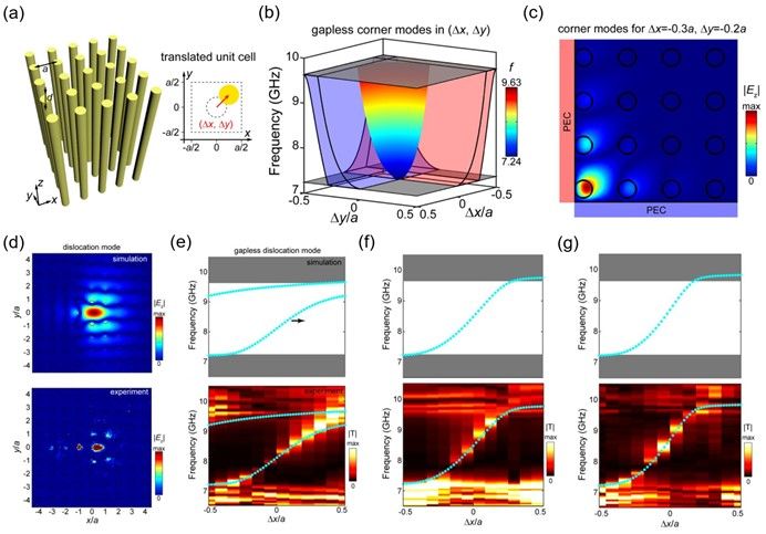 為解決這一難題,董建文教授團(tuán)隊(duì)通過在更高維度的空間中重新審視已有工作,研究發(fā)現(xiàn):過去人們習(xí)慣于在動(dòng)量空間中去實(shí)現(xiàn)和討論拓?fù)涔庾泳w,但是動(dòng)量空間的維度一般與實(shí)空間的維度保持一致,這極大地阻礙了人們對(duì)高緯度空間的拓?fù)淠J降奶剿?。受到合成維度物理和四維量子霍爾效應(yīng)的啟發(fā),董建文教授團(tuán)隊(duì)通過引入兩個(gè)額外的合成平移維度,并結(jié)合二個(gè)動(dòng)量維度構(gòu)建了四維空間的第二陳晶體(如圖1(a)所示)。不同于二維空間中的第一陳數(shù),表征四維空間中晶體拓?fù)鋵傩缘耐負(fù)洳蛔兞渴堑诙悢?shù)。通過嚴(yán)格公式推導(dǎo)和詳細(xì)數(shù)值計(jì)算,他們發(fā)現(xiàn)該四維合成空間中每條獨(dú)立能帶的第二陳數(shù)恒等于1,證實(shí)了這種第二陳晶體的內(nèi)稟非平庸拓?fù)鋵傩浴_M(jìn)一步地,當(dāng)對(duì)四維合成平移空間中的第二陳晶體進(jìn)行維度截?cái)鄷r(shí)可以獲得局域在相應(yīng)低維邊界處拓?fù)淠J健L貏e地,當(dāng)同時(shí)在兩個(gè)周期方向上用PEC邊界去進(jìn)行維度截?cái)鄷r(shí),可以觀察到:局域在角落處的無帶隙拓?fù)浣悄#ㄈ鐖D1(b)(c)所示)。值得注意的是,這種無帶隙拓?fù)浣悄5拇嬖诓灰蕾囉诰w對(duì)稱,因此提供了在任意晶體結(jié)構(gòu)中實(shí)現(xiàn)光場(chǎng)局域的設(shè)計(jì)方案。同時(shí)角模頻率覆蓋整個(gè)光子禁帶頻率范圍,這對(duì)于靈活地設(shè)計(jì)拓?fù)涔庾悠骷瑯又匾蛇x擇性設(shè)計(jì)微腔的響應(yīng)頻率。此外,位錯(cuò)是一種常見的實(shí)空間晶體缺陷,同樣可以實(shí)現(xiàn)光場(chǎng)局域,支持局域模場(chǎng)。研究團(tuán)隊(duì)通過維度壓縮將四維空間投影到一維空間,揭示了頻率覆蓋整個(gè)禁帶的一維拓?fù)湮诲e(cuò)模。具體地,先固定每個(gè)原胞內(nèi)圓柱的橫向平移量Δx,然后建立縱向平移量Δy與方位角θ的線性關(guān)系后,可以得到由伯格斯矢量標(biāo)定的位錯(cuò)結(jié)構(gòu),能夠在不依靠PEC邊界的情況下實(shí)現(xiàn)光場(chǎng)局域(如圖1(d)所示)。進(jìn)一步,這種拓?fù)湮诲e(cuò)模遍歷所有Δx參數(shù)后可以重建出一維渦旋線模式(如圖1(e)所示)。需要特別指出,這種拓?fù)湮诲e(cuò)模式在引入額外的缺陷后仍然存在,證明了其對(duì)各類擾動(dòng)持有魯棒性(如圖1(f)(g)所示)。