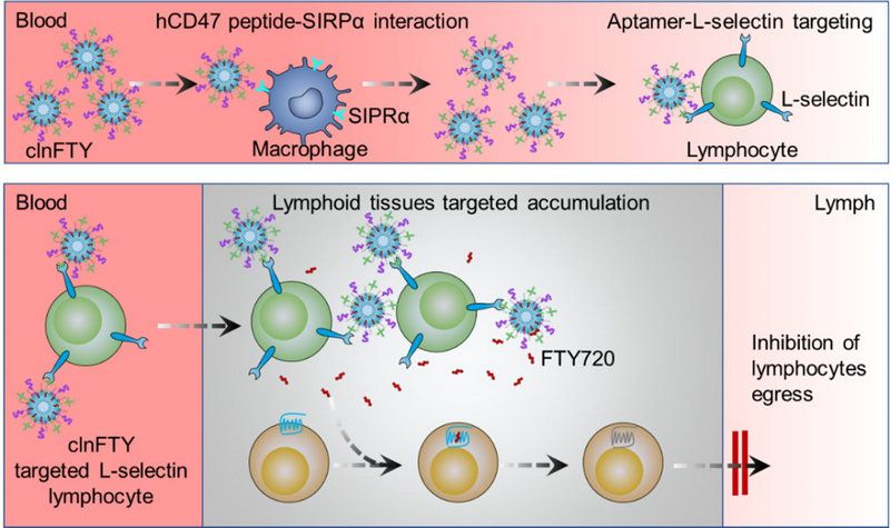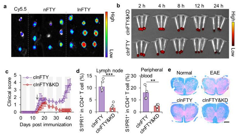 圖1 a)FTY720通過L-選擇素在淋巴結(jié)中富集;b)CD47延長FTY720在體內(nèi)的循環(huán)時(shí)間;c)一次給藥即可有效減少EAE模型行為學(xué)評(píng)分,d)降低外周T細(xì)胞比例并e)改善中樞神經(jīng)系統(tǒng)脫髓鞘損傷。
