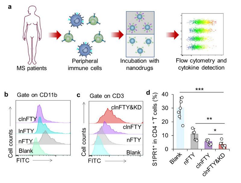 圖2 a)MS患者樣本處理示意圖;b)靶向藥物能抑制巨噬細(xì)胞的吞噬,c)促進(jìn)淋巴細(xì)胞的攝取,d)從而有效減少T淋巴細(xì)胞S1PR1的表達(dá)。