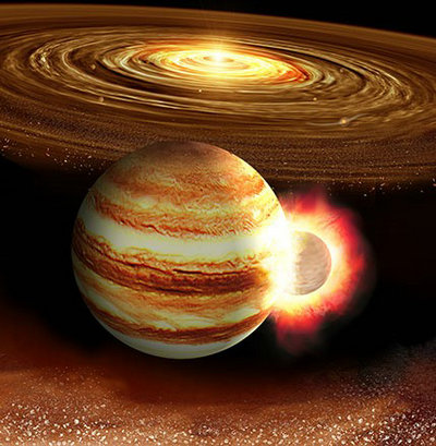 行星胚胎與木星發(fā)生了碰撞(藝術(shù)想象圖)。 [圖片來源:日本天體生物學中心]