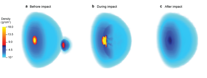 具有原初致密核的木星與一個十倍地球質(zhì)量的行星胚胎發(fā)生碰撞,結(jié)果導致稀釋核