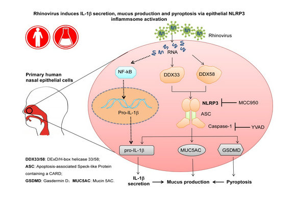 該研究揭示了NLRP3炎癥小體在鼻病毒引起的呼吸道上皮細(xì)胞免疫和功能改變中的關(guān)鍵作用,證明了呼吸道上皮炎癥小體在調(diào)控黏膜(宿主)- 病原體相互作用的新機(jī)制,為NLRP3炎癥小體作為控制氣道慢性炎癥的干預(yù)靶點提供了理論基礎(chǔ)和轉(zhuǎn)化意義。
