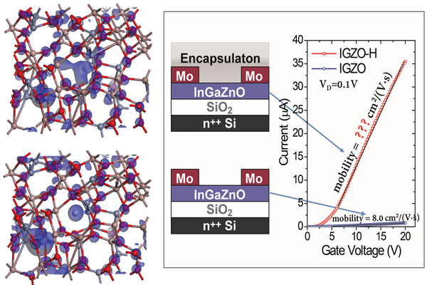 針對以上問題,近期,我校電子與信息工程學(xué)院劉川教授的研究團(tuán)隊(duì)發(fā)現(xiàn),可以通過簡單封裝和熱退火,制備出穩(wěn)定富含氫的IGZO 晶體管,其晶體管電學(xué)性能、穩(wěn)定性都獲得大大提高。制備方法較簡單且重復(fù)性高,即用氮化硅薄膜封裝,再通過熱擴(kuò)散將氮化硅內(nèi)氫元素?cái)U(kuò)散至InGaZnO薄膜內(nèi)。摻氫后的晶體管,其開態(tài)電流和開關(guān)比都獲得了數(shù)量級的提升(約40倍),而且閾值電壓沒有太大變化。而對應(yīng)提取出的場效應(yīng)遷移率則出現(xiàn)異常,大于300 cm2/(V·s),遠(yuǎn)高于未經(jīng)處理的對照樣品。然后結(jié)合二次離子質(zhì)譜儀(SIMS)和X射線光電子能譜分析(XPS)表征,發(fā)現(xiàn)薄膜內(nèi)不但氫濃度提升了約一個(gè)數(shù)量級,而且氧空位缺陷態(tài)也大大減少了,而自由電子濃度則相應(yīng)顯著增加。
