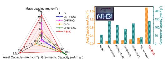 多孔鉍-碳復合材料和所研發(fā)的鎳鉍電池的面積容量和質量比電容