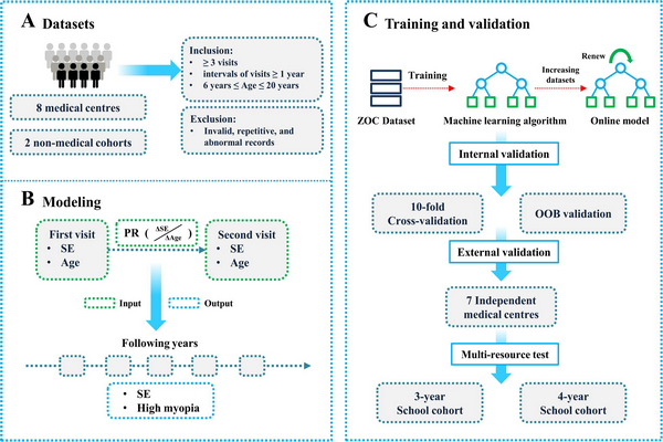 既往青少年近視眼研究數(shù)據(jù)量小,無法完全反映其發(fā)展規(guī)律,因此不能有效進(jìn)行預(yù)測(cè)及早期精準(zhǔn)干預(yù)。近視眼一旦發(fā)展為高度近視,可導(dǎo)致視網(wǎng)膜變性、脫離等不可逆損害,嚴(yán)重影響孩子們的身心健康。如果能夠在早期預(yù)測(cè)其發(fā)展規(guī)律,通過增加戶外活動(dòng)等早期干預(yù)手段,就可減緩近視眼的發(fā)生發(fā)展,對(duì)降低高度近視的風(fēng)險(xiǎn)有重要意義。