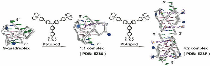 Pt-tripod與人體端粒G-四鏈體Tel26的動態(tài)結(jié)合,Pt-tripod逐步誘導Tel26形成