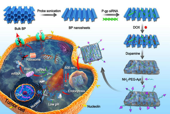 為了解決黑磷在藥物載體系統(tǒng)的上述局限,梅林教授課題組設(shè)計了一種簡易高效的方法。該項工作在黑磷表面包裹一層仿生的聚多巴胺膜(Polydopamine, PDA),形成一種“納米膠囊”結(jié)構(gòu)。聚多巴胺具有良好的生物相容性,可以有效隔離氧氣或水與黑磷納米片的接觸,從而提高其穩(wěn)定性。此外,聚多巴胺自身具有良好的光熱效應(yīng),因此聚多巴胺的包覆可以進一步增強黑磷藥物載體系統(tǒng)的光熱效應(yīng)。在此基礎(chǔ)上,科研人員將小干擾RNA(siRNA)和廣譜性抗癌藥物多柔比星(DOX)負載到了“納米膠囊”內(nèi)部,并在聚多巴胺表面修飾上了靶向基團核酸適配體(Aptamer, Apt),制備了一種集化療、基因治療和光熱治療于一體的多功能靶向納米載藥平臺。目前,該研究在動物體內(nèi)實驗上取得突破,并在乳腺癌模型的裸鼠身上取得了良好的腫瘤治療效果。