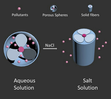 近日,我?;瘜W學院黃哲鋼教授課題組以咔唑為中心,在其2,7,9號為分別進行芳基化,制備了新型的二維、三維的螺旋槳狀芳香性兩親物, 并通過折疊芳香性平面的組裝制備了空心球。與傳統(tǒng)的基于一維芳香性分子的超分子多孔材料相比,二、三維π-共軛組裝體在水溶液中提供了疏水性碳環(huán)境,可以吸附回收水中的有機污染物。研究結(jié)果表明,制備的介孔球?qū)τ袡C污染物—乙炔雌二醇(Eo)和雙酚A(BPA)的回收率分別為92%和90%。值得注意的是,介孔球可以識別鹽的濃度。隨著鹽的加入,折疊的芳香性分子被觀察到逐漸變得平坦,誘導(dǎo)強的π-π相互作用,使多孔球體融化并相連一起形成實心的纖維。這種多孔向無孔材料的轉(zhuǎn)變引發(fā)被吸附的污染物從多孔結(jié)構(gòu)中自發(fā)釋放,而隨后的透析使超分子多孔結(jié)構(gòu)恢復(fù)吸附容量。