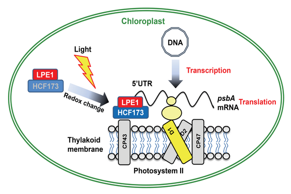通過系統(tǒng)篩查,研究人員鑒定到一個高等植物特有的PSII生物發(fā)生調(diào)控因子——LPE1(LOW PHOTOSYNTHETIC EFFICIENCY 1)。通過生理學(xué)、分子生物學(xué)、生物化學(xué)和遺傳學(xué)等手段研究發(fā)現(xiàn),LPE1基因突變導(dǎo)致PSII活性劇烈降低,PSII生物發(fā)生嚴(yán)重受阻;同時光PSII核心蛋白D1的合成明顯受損。值得注意的是,LPE1編碼一個葉綠體PPR蛋白,直接與D1編碼基因psbA mRNA的5'UTR結(jié)合,從而招募核糖體并啟動D1蛋白的翻譯。更重要的是,LPE1同時與已知的D1翻譯因子HCF173(HIGH CHLOROPHYLL FLUORESCENCE 173)互作,促使HCF173與psbA mRNA結(jié)合,協(xié)同參與調(diào)控PSII生物發(fā)生。
