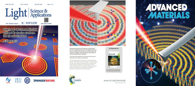 該團隊的研究組提出采用規(guī)則幾何納米結構和摻雜來實現(xiàn)光場在納米尺度上的精確局域化和調控,實現(xiàn)了單層石墨烯規(guī)則幾何納米結構剪裁中紅外電磁場在單原子二維平面的局域分布、波長與強度調控。通過構建單層石墨烯規(guī)則幾何納米結構,利用邊界對表面等離激元波的反射,形成多重干涉效應,實現(xiàn)了對10.7 μm入射波的光場局域化,并且通過納米結構的幾何形狀調控其空間分布,結果以封面文章發(fā)表在Light: Science & Applications 2017, 6, e17057上。另外,通過對單層石墨烯進行硝酸根化學摻雜,實現(xiàn)了單層石墨烯表面等離激元強度提高了約2倍、波長由150 nm提高到了280 nm,結果以背封面文章發(fā)表在Nanoscale 2016, 8, 16621上。