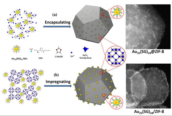 催化劑合成過程示意圖及相應(yīng)的高角環(huán)形暗場掃描透射電鏡圖: a) Au25(SG)18@ZIF-8 (Au25(SG)18組裝入ZIF-8框架內(nèi)部) ;b) Au25(SG)18/ZIF-8 (Au25(SG)18浸漬在ZIF-8外表面)