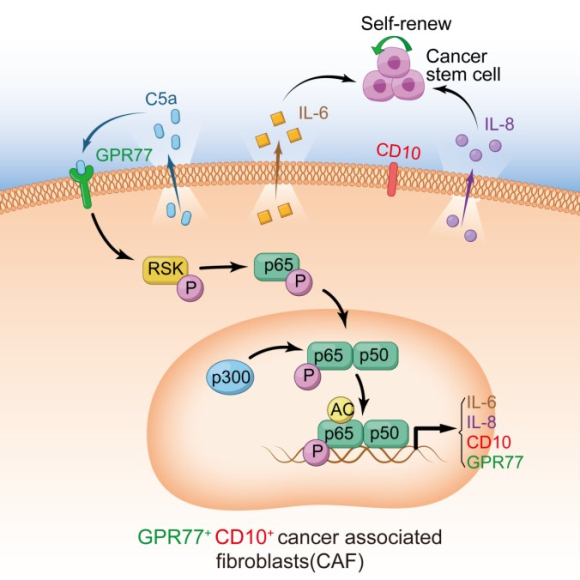 機(jī)制研究發(fā)現(xiàn):CD10+GPR77+成纖維細(xì)胞亞群通過IL-6,IL-8維持腫瘤干細(xì)胞干性,從而導(dǎo)致腫瘤化療耐藥。IL-6,IL-8的分泌由持續(xù)激活的NF-kB信號(hào)調(diào)控。有趣的是,在這群細(xì)胞中NF-kB的持續(xù)激活不依賴IkB的降解。進(jìn)一步研究發(fā)現(xiàn),腫瘤微環(huán)境中的C5a作用于其受體GPR77,使下游RSK-1磷酸化,進(jìn)而介導(dǎo)了非IKK依賴的p65 Ser536磷酸化。而該位點(diǎn)的磷酸化是p300介導(dǎo)的p65 lys310乙?;幕A(chǔ)。p65乙?;瘜?dǎo)致p65持續(xù)滯留在細(xì)胞核內(nèi),導(dǎo)致了NF-kB信號(hào)的持續(xù)激活。該研究首次闡述了補(bǔ)體分子對(duì)炎癥轉(zhuǎn)錄因子轉(zhuǎn)錄后修飾的調(diào)控作用。
