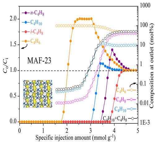 團(tuán):研究團(tuán)隊(duì)對(duì)10例代表性配位聚合物多孔材料的計(jì)算機(jī)模擬和實(shí)驗(yàn)結(jié)果證實(shí),形狀尺寸合適的離散孔洞最有利于控制柔性客體分子的構(gòu)型和并反轉(zhuǎn)吸附選擇性,而連續(xù)的孔道對(duì)客體分子的吸附擴(kuò)散又是必須的。通過(guò)模擬計(jì)算,發(fā)現(xiàn)具有準(zhǔn)離散孔洞的柔性多孔材料MAF-23在兩種要求中取得平衡,實(shí)現(xiàn)了反常而且最優(yōu)的C4烴類混合物吸附分離順序。常溫常壓下將丁二烯、丁烯、異丁烯和丁烷混合物通過(guò)MAF-23填充的固定床吸附裝置后,吸附最弱的丁二烯最先流出而且純度很容易達(dá)到99.9%,同時(shí)可避免常規(guī)純化方法中因加熱而產(chǎn)生的丁二烯自聚問(wèn)題。相關(guān)工作發(fā)表于國(guó)際權(quán)威雜志《科學(xué)》上,受到了廣泛的關(guān)注。