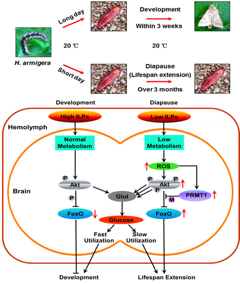 以農(nóng)業(yè)害蟲棉鈴蟲的滯育(類似冬眠,和生命延長同義)為研究目標(biāo),發(fā)現(xiàn)了第一例自然發(fā)生的、生理水平的ROS作為胞內(nèi)信號調(diào)節(jié)腦的一個(gè)獨(dú)特的胰島素信號路徑來實(shí)現(xiàn)生命延長 (見下圖),證明了生理水平的ROS對生物體的有益性以及延長生命的獨(dú)特機(jī)制是本項(xiàng)工作的核心創(chuàng)新點(diǎn)。