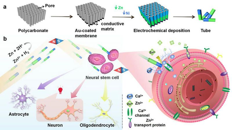 圖1 Ni-Zn微馬達(dá)的制備及靶向激活神經(jīng)干細(xì)胞和引導(dǎo)細(xì)胞分化的示意圖