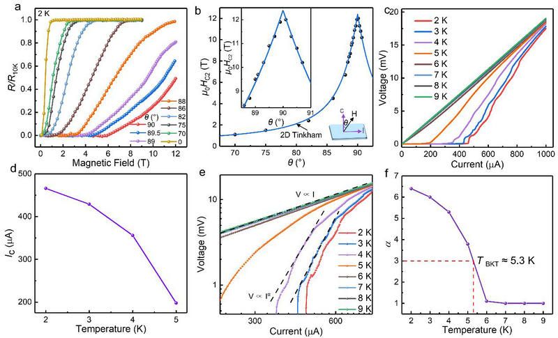 圖2: Bi3O2S3的二維超導特性。(a) 不同磁場方向的電阻-磁場曲線;(b)二維Tinkham公式擬合的角度依賴上臨界場曲線;(c)不同溫度的電壓-電流曲線;(d)臨界電流-溫度曲線;(e)雙對數(shù)坐標下的電壓-電流曲線;(f) BKT相變溫度。