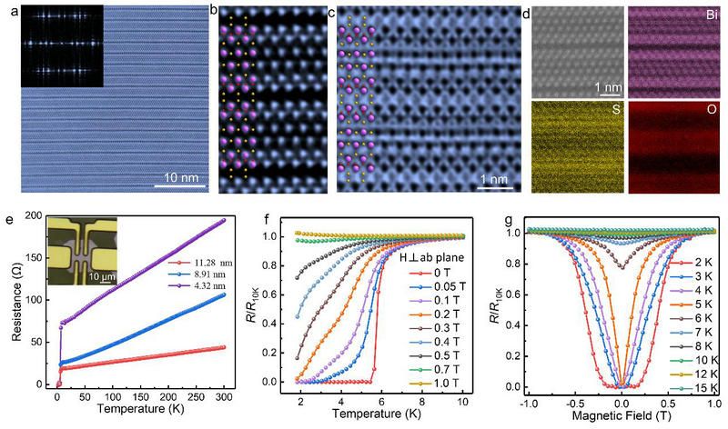 圖1:Bi3O2S3的結(jié)構(gòu)表征以及磁輸運測量。(a, b)HAADF-STEM原子像;(c)ABF-STEM原子像;(d)原子級EDS掃描;(e)電阻-溫度曲線;(f) 不同磁場下的低溫區(qū)電阻-溫度曲線;(g)不同溫度下的電阻-磁場曲線。