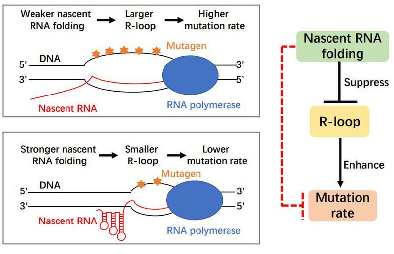 在前期研究中,團隊成員發(fā)現(xiàn)提升報告基因CAN1的新生RNA二級結(jié)構(gòu)穩(wěn)定性可以競爭性抑制R-loop(RNA-DNA雜合雙鏈)的形成,從而減少基因轉(zhuǎn)錄引起的DNA突變(圖2)。利用eSPET-seq的數(shù)據(jù)和公開的基因組R-loop與突變率數(shù)據(jù),本研究發(fā)現(xiàn)新生RNA折疊的抑突變作用對酵母基因組和腫瘤基因組的突變率都產(chǎn)生了影響——新生RNA二級結(jié)構(gòu)越強的基因,其突變率越低。換言之,RNA作為遺傳信息的載體,反過來對遺傳信息本身的準確性(突變率)產(chǎn)生了影響。