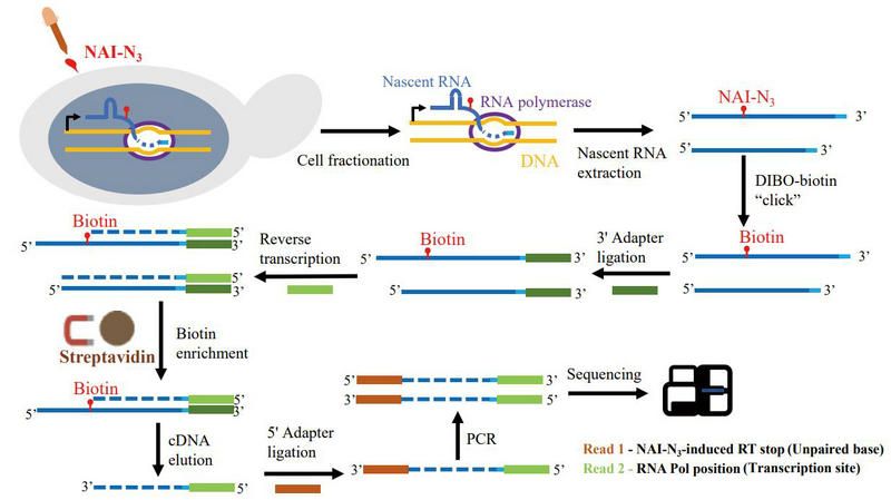 團隊采用小分子藥物NAI-N3對釀酒酵母細胞內(nèi)RNA上的單鏈位點進行特異性標記,同時富集轉(zhuǎn)錄中的新生RNA,最后通過高通量測序的方法確定轉(zhuǎn)錄進程以及對應的RNA二級結(jié)構(gòu)(圖1)。實驗數(shù)據(jù)提示,新生RNA的二級結(jié)構(gòu)常常隨著轉(zhuǎn)錄的進行而出現(xiàn)動態(tài)變化,但最終形成的結(jié)構(gòu)與細胞質(zhì)中的成熟RNA整體較為相似。
