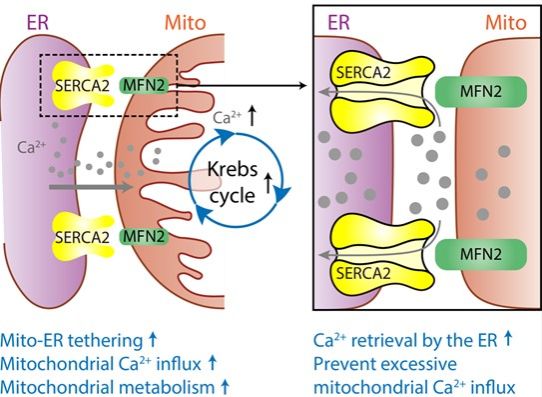 MFN2介導(dǎo)線粒體-內(nèi)質(zhì)網(wǎng)耦連的機(jī)制目前尚有爭(zhēng)議。既往研究指出除了經(jīng)典的線粒體外膜定位外,MFN2還可能存在內(nèi)質(zhì)網(wǎng)定位,進(jìn)而通過(guò)同源互作介導(dǎo)該過(guò)程。而在本研究中,研究者通過(guò)細(xì)胞組分分析實(shí)驗(yàn)發(fā)現(xiàn)T細(xì)胞內(nèi)質(zhì)網(wǎng)上并無(wú)MFN2。研究者純化出全長(zhǎng)MFN2蛋白,與T細(xì)胞裂解物共孵育后通過(guò)LC-MS/MS實(shí)驗(yàn)鑒定了潛在與MFN2互作的內(nèi)質(zhì)網(wǎng)蛋白—SERCA2,隨后應(yīng)用多種實(shí)驗(yàn)手段證實(shí)了MFN2和SERCA2的相互作用。