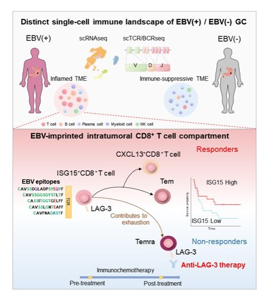 胃癌是嚴重危害國民健康的惡性疾病,其發(fā)病率和死亡率均占惡性腫瘤前三位。免疫檢查點抑制劑(ICIs)的使用為腫瘤治療帶來新的曙光,但在胃癌治療中,ICIs單藥的有效率只有10%左右,因此有必要探索療效預(yù)測指標以甄別獲益人群,避免無效用藥。既往文獻報道EB病毒陽性胃癌患者對PD-1抗體的有效率(約為25%)顯著高于整體胃癌患者(10%)。EB病毒感染如何影響免疫療效是亟待探究的重要科學(xué)問題。