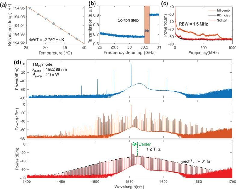 圖3. 亮孤子產(chǎn)生實(shí)驗(yàn)驗(yàn)證(a)GeSbS微諧振腔的熱光系數(shù);(b)掃頻過程微諧振腔的傳輸譜線;(c)不同頻梳狀態(tài)下的強(qiáng)度噪聲頻譜;(d)頻梳頻譜演變。