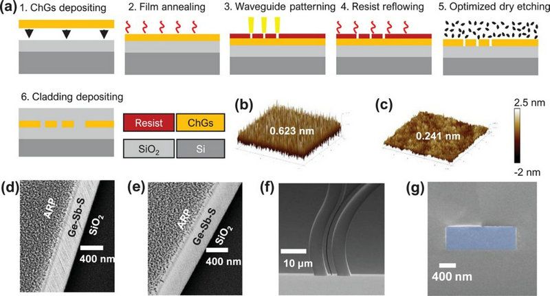 圖2. 制備工藝和表征(a)高Q值集成微諧振腔的制備工藝;(b、c)5×5μm2面積的片上GeSbS薄膜在退火前和350℃退火后的3D原子力顯微(AFM)圖像;(d-g)使用改進(jìn)干法刻蝕工藝前后的波導(dǎo)側(cè)壁、滑輪波導(dǎo)耦合結(jié)構(gòu)、具有二氧化硅包層的波導(dǎo)的SEM圖像。