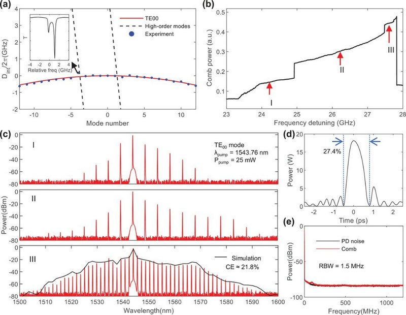 圖4. 暗孤子產(chǎn)生實(shí)驗(yàn)驗(yàn)證(a)具有模式交叉特性到的集成色散曲線;(b)掃頻過程微諧振腔的傳輸譜線;(c)頻梳頻譜演變;(d)仿真時(shí)域脈沖占空比約為27.4%;(e)強(qiáng)度噪聲頻譜。