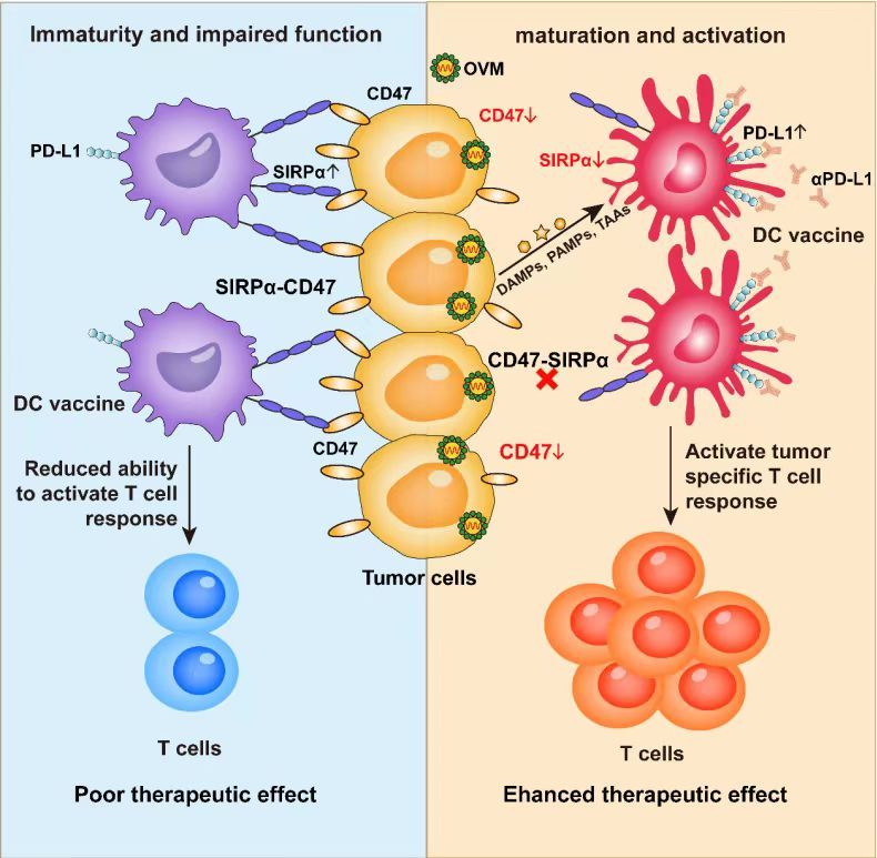 2023年10月11日,中山大學(xué)中山醫(yī)學(xué)院顏光美教授/林園教授團(tuán)隊(duì)在Cell Reports Medicine上發(fā)表了題為“Oncolytic virus M1 functions as a bifunctional checkpoint inhibitor to enhance the antitumor activity of DC vaccine”的研究,該研究發(fā)現(xiàn)腫瘤細(xì)胞通過(guò)接觸依賴(lài)的信號(hào)調(diào)節(jié)蛋白α(Signal Regulatory Protein α,SIRPα)-CD47免疫檢查點(diǎn)通路抑制DC的成熟并削弱了DC疫苗的抗腫瘤活性,而溶瘤病毒M1(OVM)能夠分別下調(diào)DC中的SIRPα以及腫瘤細(xì)胞中的CD47,逆轉(zhuǎn)腫瘤對(duì)DC疫苗的抑制作用,從而提高DC疫苗在多種荷瘤小鼠模型中的治療效果,而這一作用可被PD-L1阻斷進(jìn)一步增強(qiáng)。