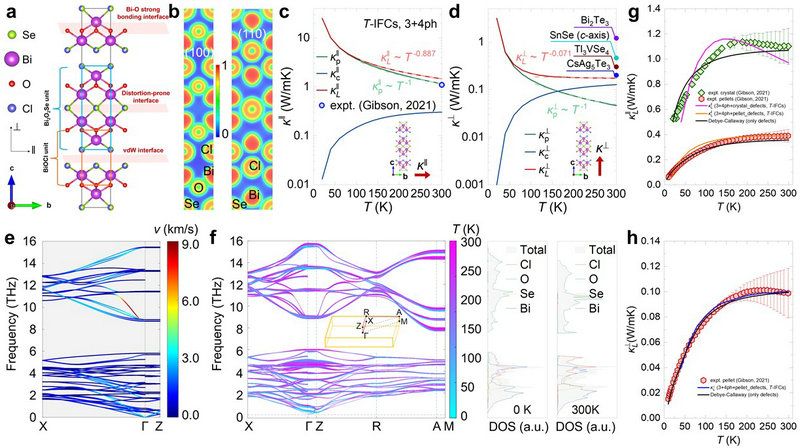 圖1. (a) Bi4O4SeCl2晶體結(jié)構(gòu)。 (b) 沿 (100) 和 (110) 平面的電子局域函數(shù)。(c)平面內(nèi)和(d)垂直平面方向的晶格熱導(dǎo)率與溫度的關(guān)系。(e) 沿平面內(nèi)和垂直面方向的聲子群速度。(f) 不同溫度下的聲子色散(左)和聲子態(tài)密度(右)。(c)平面內(nèi)和(d)垂直平面方向的晶格熱導(dǎo)率(引入缺陷散射)與溫度的關(guān)系。