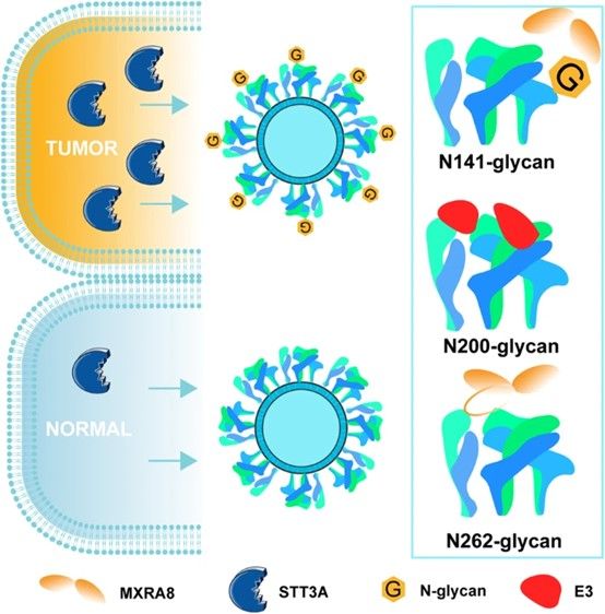 該團隊在先前的研究中已經(jīng)鑒定基質重塑相關蛋白8(matrix remodeling associated 8, MXRA 8)是OVM的受體,并且將MXRA 8設定為指示OVM高效溶瘤的生物標志物之一。然而,考慮到病毒蛋白的翻譯后修飾可能會影響病毒與受體的結合,作者進一步對OVM上N-糖基的結構與功能展開了研究,以闡明OVM對腫瘤細胞選擇性的機制。