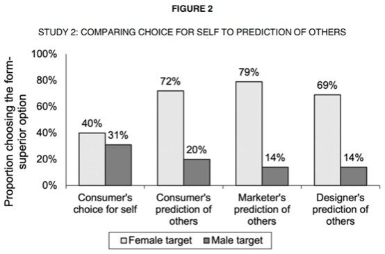 為了檢驗上述假設(shè),作者進(jìn)行了七項實驗和四個后續(xù)實驗。研究發(fā)現(xiàn)在面對產(chǎn)品外形和功能權(quán)衡時,人們?yōu)樗撕蜑樽约鹤鞒龅漠a(chǎn)品決策存在顯著的不一致(實驗1、2、5A、5B),即人們更傾向于為女性他人(vs.男性他人)選擇外形優(yōu)越(vs.功能優(yōu)越)產(chǎn)品,但為自己選擇時則無性別差異,這個結(jié)論不僅適用普通消費者(實驗1、2、5A、5B、后續(xù)實驗1)還適用于市場營銷人員及產(chǎn)品設(shè)計人員(實驗2,如下圖)。