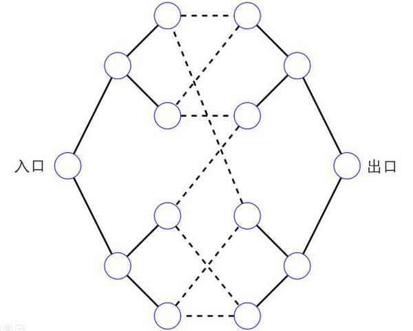 焊接樹問題是少數幾個基于量子游走展現出量子指數加速優(yōu)勢的問題。形象地說,該問題是要從迷宮入口找到出口,每走一步只能探索周邊有路徑相連的位置。這里的“迷宮”是兩棵深度為n的完全二叉樹,它們水平相對放置,中間的葉子左右隨機交替“焊接”起來形成一個回路,如下圖中虛線所示。假設“迷宮”的信息存放在一張鄰接表中。那么,在“迷宮”中每走一步,都需要訪問一次鄰接表以獲取當前位置的相鄰信息。焊接樹問題即要求盡可能少地訪問鄰接表從入口找到出口,其中訪問鄰接表的次數稱為查詢復雜度??梢宰C明針對該問題的任何經典算法的查詢復雜度都是n的指數量級,即為 Ω(2n)。