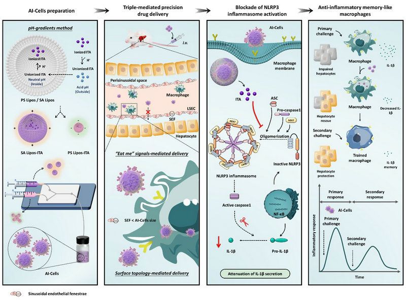 研究團(tuán)隊(duì)基于肝衰竭病理特征,設(shè)計(jì)了一款負(fù)載衣康酸的人工治療細(xì)胞AI-Cells(圖1)。AI-Cells模擬凋亡細(xì)胞的拓?fù)浣Y(jié)構(gòu)和細(xì)胞膜組成,成功實(shí)現(xiàn)了對(duì)肝巨噬細(xì)胞的精準(zhǔn)捕獲。并通過(guò)干擾NLRP3炎癥小體的自組裝調(diào)控肝巨噬細(xì)胞使其恢復(fù)穩(wěn)態(tài);同時(shí)誘導(dǎo)抗炎記憶樣巨噬細(xì)胞產(chǎn)生,進(jìn)而對(duì)急性肝衰竭和肝再損傷產(chǎn)生了良好的治療作用。
