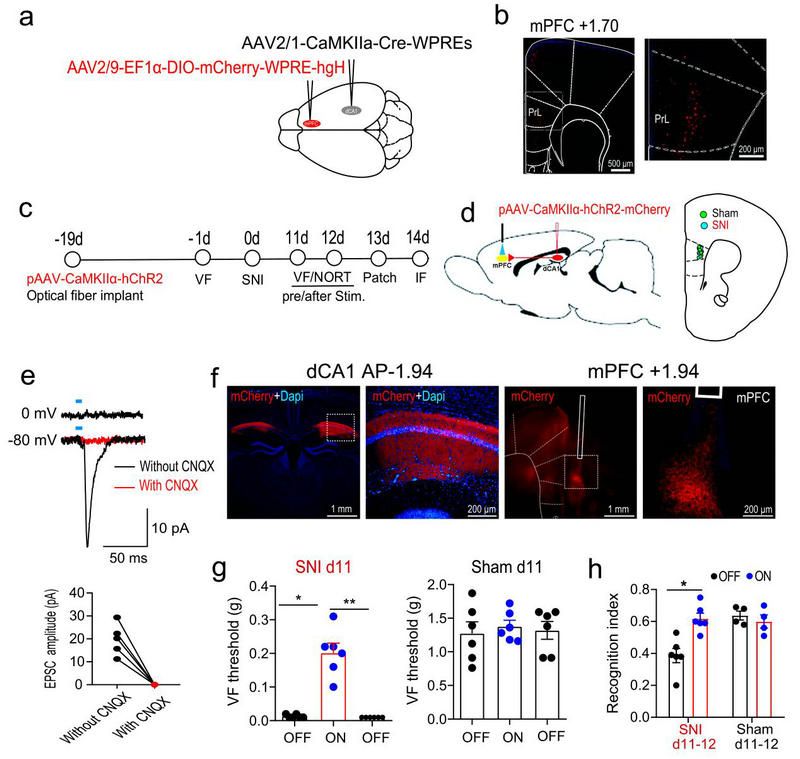 此研究利用經典疼痛模型部分坐骨神經損傷模型建立疼痛與記憶障礙共病模型,通過在體鈣信號記錄,在體多通道記錄和離體全細胞膜片鉗實驗發(fā)現(xiàn),共病小鼠背側海馬CA1錐體神經元興奮性明顯下降,谷氨酸能而非GABA能突觸傳遞功能受損?;瘜W遺傳學激活dCA1錐體神經元可緩解并改善記憶功能。通過CTB488逆標以及進一步的Cre-DIO系統(tǒng)驗證,共病小鼠背側海馬CA1投射到PrL興奮性突觸傳遞功能減弱。通過在體光遺傳學或化學遺傳學技術特異性激活dCA1-PrL通路可緩解共病;而特異性抑制dCA1-PrL通路可誘導正常小鼠出現(xiàn)共病樣行為。