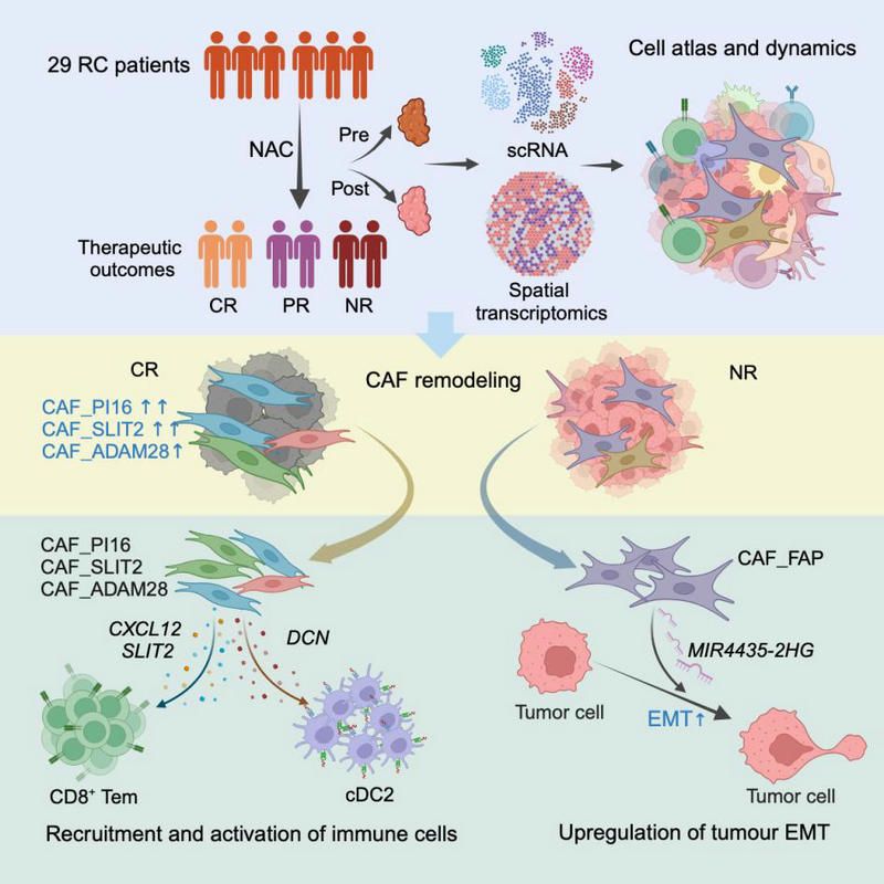 考慮到上述問題,任東林、林宏城團隊招募了29例直腸癌患者,在新輔助化療前后分別取樣,并對樣本進行了單細胞轉錄組測序和空間轉錄組測序。研究團隊根據療效將樣本分為CR(完全緩解)、PR(部分緩解)和NR(無明顯緩解)三個分組進行治療前后和不同療效之間的多維度分析,構建了腫瘤微環(huán)境在新輔助化療前后動態(tài)變化的細胞圖譜,實現腫瘤微環(huán)境如何影響新輔助化療療效的系統(tǒng)研究。