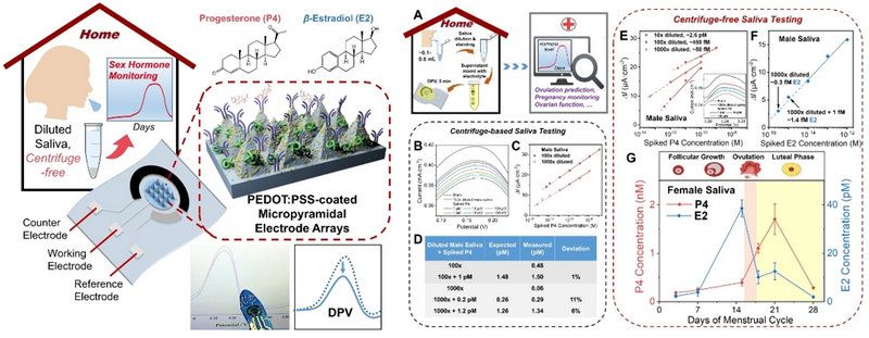 近期,中山大學(xué)材料科學(xué)與工程學(xué)院謝莊副教授課題組提出了一種三維微結(jié)構(gòu)柔性電極策略,實(shí)現(xiàn)了低成本亞飛摩級(jí)的性激素電化學(xué)免疫傳感。該傳感器能夠直接檢測(cè)高度稀釋的唾液樣本中的激素,無需使用離心等儀器,從而便于在家中進(jìn)行唾液測(cè)試和監(jiān)測(cè)整個(gè)女性月經(jīng)周期中的唾液P4和E2。傳感器的核心是基于在微金字塔陣列涂覆摻雜三氟甲烷磺酰胺鋰(LiTFSI)的聚(3,4-亞乙基二氧噻吩):聚(4-苯乙烯磺酸鹽)(PEDOT:PSS)的導(dǎo)電高分子電極及結(jié)合金納米粒子(AuNPs)以促進(jìn)激素抗體的固定。這種簡單的免疫傳感工作電極通過微針尖促進(jìn)分子擴(kuò)散富集,可以在幾分鐘內(nèi)經(jīng)由微分脈沖伏安法(DPV)的峰值電流下降,實(shí)現(xiàn)P4和E2在亞fM到μM水平的高靈敏寬范圍電化學(xué)檢測(cè)。