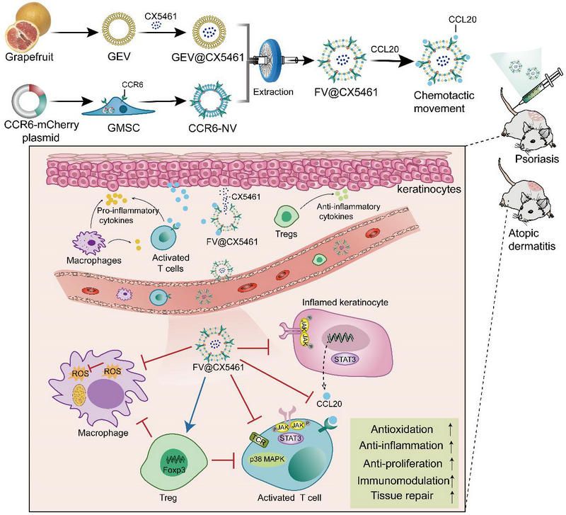 另一方面,為了進(jìn)一步提高載藥囊泡的療效和安全性,還需要靶向性的策略實(shí)現(xiàn)對(duì)浸潤(rùn)免疫細(xì)胞的精確干預(yù)。通過(guò)臨床測(cè)序數(shù)據(jù)分析發(fā)現(xiàn)趨化因子 CCL20 在多種自身免疫性疾病的病變組織中升高,因此攜帶趨化因子受體 CCR6 的納米囊泡可能通過(guò)與病損部位的 CCL20 相互作用靶向炎癥組織。由于現(xiàn)有技術(shù)手段的局限性,與動(dòng)物來(lái)源的外泌體/細(xì)胞膜囊泡相比,植物外泌體難以通過(guò)基因工程進(jìn)行功能化修飾。研究團(tuán)隊(duì)設(shè)想開(kāi)發(fā)能兼顧間充質(zhì)干細(xì)胞外泌體的免疫調(diào)節(jié)作用和靶向性以及植物外泌體的抗氧化作用的新型納米囊泡。因此構(gòu)建了修飾CCR6受體的牙齦間充質(zhì)干細(xì)胞來(lái)源的細(xì)胞膜囊泡,并利用細(xì)胞膜囊泡/外泌體具有雙層脂質(zhì)膜的相似生物物理特性,將包載CX5461的西柚外泌體與之融合制備載藥融合納米囊泡,研究結(jié)果表明,在銀屑病和特應(yīng)性皮炎模型中,融合囊泡通過(guò)靶向抑制炎癥免疫細(xì)胞、重塑失衡的免疫微環(huán)境,從而緩解皮膚癥狀。