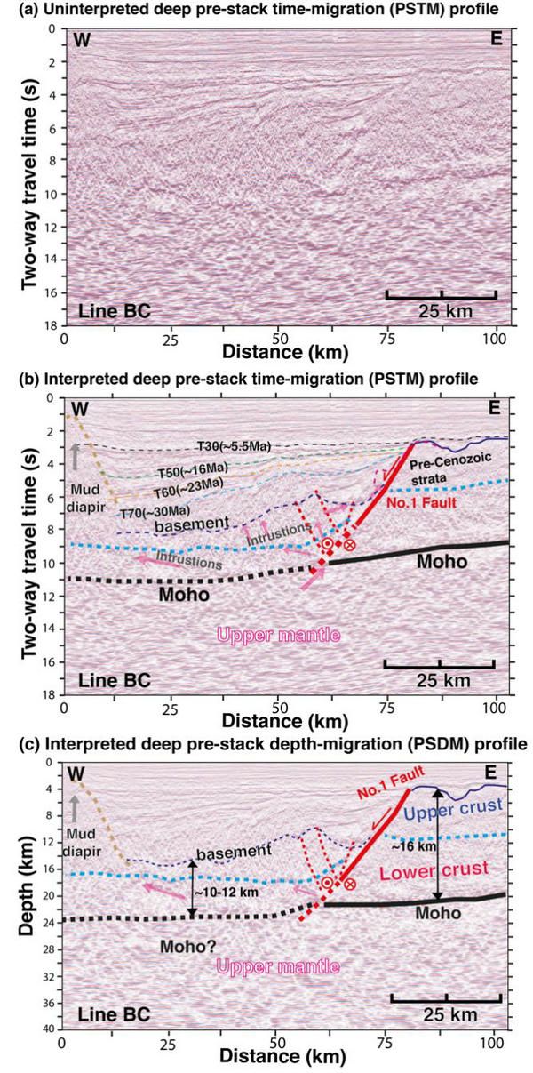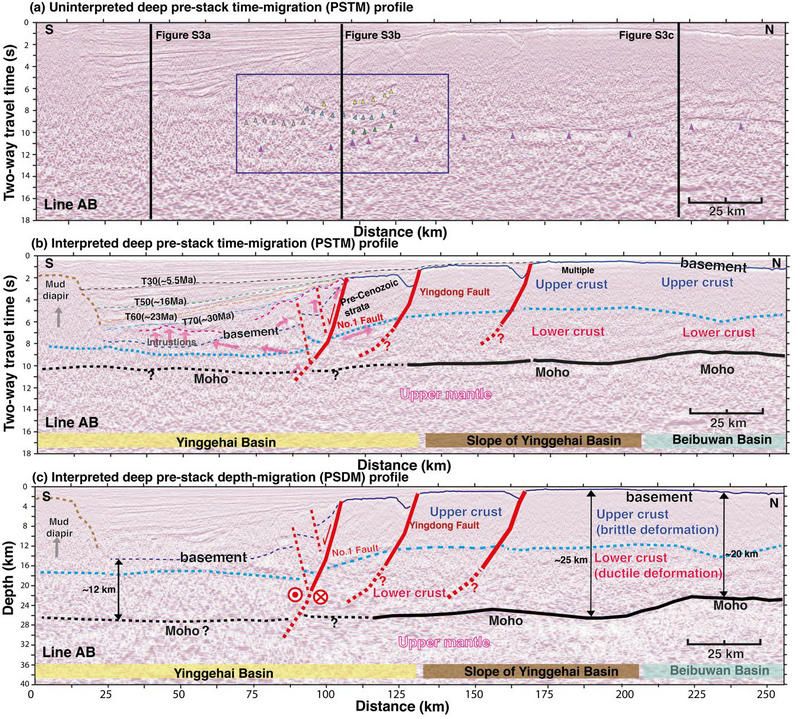 圖2 (a)未解釋的深反射疊前時(shí)間偏移剖面AB。紫色三角形指向莫霍面反射信號(hào)。藍(lán)色方框標(biāo)記了紅河斷裂北支一號(hào)斷裂下方地殼內(nèi)部不連續(xù)與錯(cuò)斷的反射同相軸,指示了紅河斷裂(即一號(hào)斷裂)的剪切作用形成了該區(qū)域復(fù)雜的反射地震信號(hào)。(b)解釋的深反射疊前時(shí)間偏移剖面AB。紅色(實(shí)線和虛線)表示解釋的深大斷裂。不同顏色的細(xì)虛線標(biāo)記了地層邊界。藍(lán)色實(shí)線和虛線代表解釋的沉積盆地基底。黑色實(shí)線和虛線代表解釋的莫霍面邊界。較粗的淺藍(lán)色虛線代表上地殼和下地殼的邊界。粉紅色箭頭指示巖漿侵入的可能路徑,粉紅色虛線表示巖漿侵入的頂部。Basement:沉積盆地基底;Upper crust:上地殼;Lower crust:下地殼;Moho:莫霍面;No. 1 Fault: 一號(hào)斷裂,即紅河斷裂在鶯歌海的北支;Yingdong Fault:鶯東斷裂;Intrusions:巖漿侵入;Upper mantle:上地幔。(c)與圖2b類(lèi)似,但是為疊前深度偏移剖面AB。圖中數(shù)字代表地殼厚度。