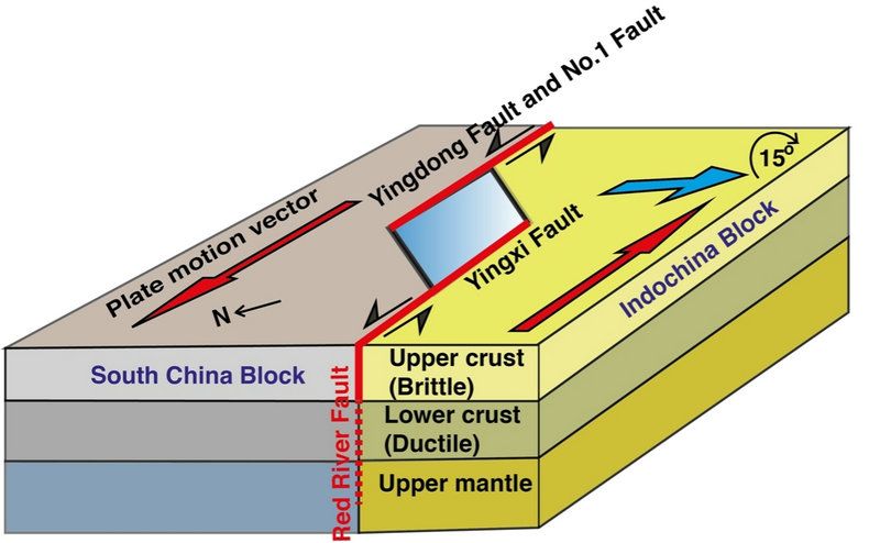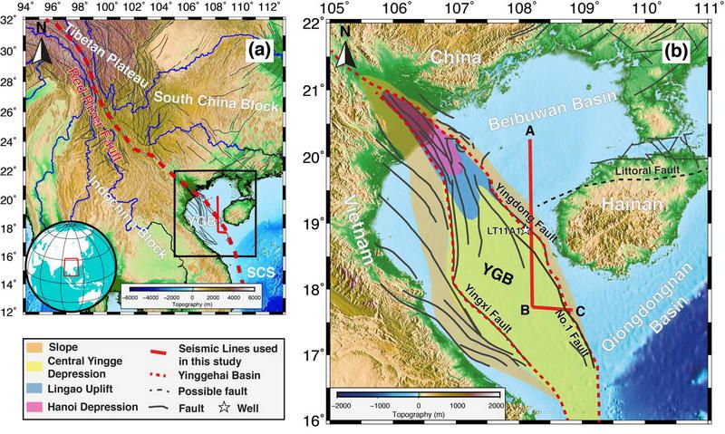 中大新聞網(wǎng)訊(通訊員李倫)印度板塊與亞洲板塊的碰撞不僅形成了世界上最高與巨厚地殼的青藏高原,還導(dǎo)致高原物質(zhì)向外逃逸。前人研究提出了兩種端元模型來(lái)解釋青藏高原物質(zhì)是如何逃逸的。其中一種是大陸擠壓模型,該模型提出青藏高原是沿著幾條巖石圈尺度走滑斷裂向外逃逸,其中該模型預(yù)測(cè)紅河斷裂是青藏高原物質(zhì)向東南逃逸的一條巖石圈尺度斷裂;另外一種是地殼流模型,該模型提出青藏高原物質(zhì)主要是以中下地殼流方式向外逃逸。發(fā)育在青藏高原北部金沙江縫合帶并向東南延伸,經(jīng)過(guò)紅河至鶯歌海盆地延綿~1000公里長(zhǎng)的紅河斷裂被認(rèn)為是這些大規(guī)模走滑斷裂中一條規(guī)模巨大的斷裂。因此,精細(xì)探測(cè)紅河斷裂的屬性(幾何結(jié)構(gòu)、變形樣式和深度延伸)是揭露青藏高原物質(zhì)向東南方向逃逸過(guò)程的關(guān)鍵。