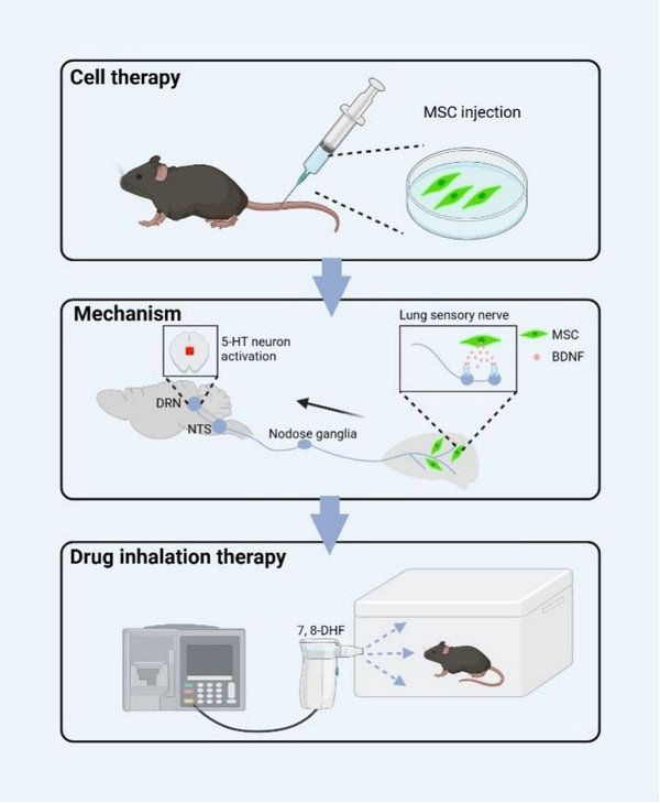 為了回答這一問題,中山大學中山醫(yī)學院項鵬教授和張小然副教授團隊開展研究,近日在Nature Communications上發(fā)表了題為“Mesenchymal stromal cells alleviate depressive and anxiety-like behaviors via a lung vagal-to-brain axis in male mice”的論文,研究揭示了MSC通過肺迷走傳入神經→孤束核→中縫背核神經通路發(fā)揮抗抑郁和抗焦慮作用。