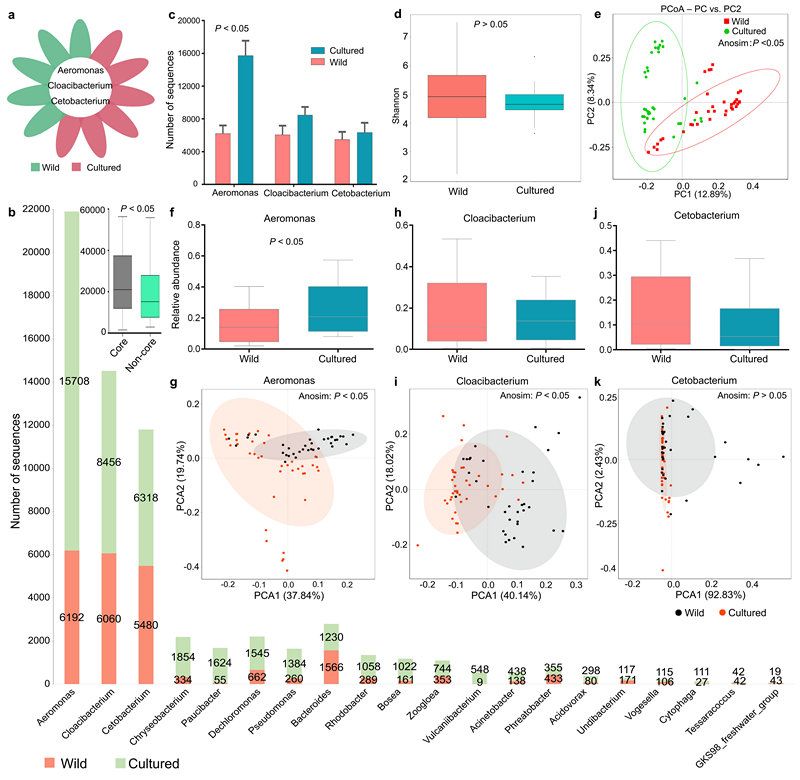 該研究揭示了以下重要發(fā)現(xiàn):(a) 野生和飼養(yǎng)的腹足綱動物的腸道微生物群落存在顯著差異,不同的腹足綱動物種類都存在腸道核心微生物Aeromonas、Cloacibacterium和Cetobacterium;(b) 在腹足綱動物中,盡管水平傳遞占據(jù)了大部分腸道菌群的傳播比例,但約43%的腸道微生物可以在非無菌環(huán)境中通過垂直傳遞的方式遺傳給下一代;(c) 在非無菌條件下,野生腹足綱動物的腸道微生物可以維持長達2代,之后F3和F4代的腸道菌群的組成會逐漸與飼養(yǎng)的腹足綱動物腸道菌群趨同;(d) 腸道菌群的趨同進化可能有助于腹足綱動物從野生環(huán)境到養(yǎng)殖環(huán)境的適應性進化,并且這一過程與代謝功能相關;(e) 垂直傳遞而不是水平傳遞推動了腸道菌群的趨同進化,促進宿主健康。這表明腸道微生物群落結(jié)構(gòu)的變化可以作為宿主健康水平或當前狀態(tài)的潛在指標;(f) 發(fā)現(xiàn)核心微生物Aeromonas和Cloacibacterium不僅能夠跨多子代垂直傳遞,還可在宿主不同發(fā)育階段中縱向傳播,為腸道定植菌。
