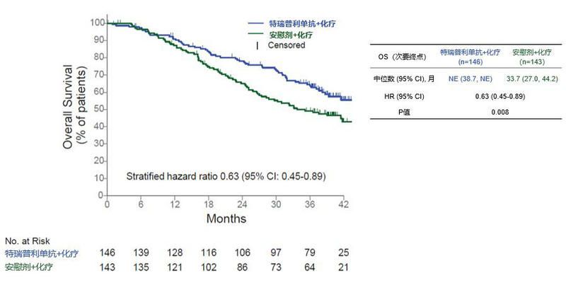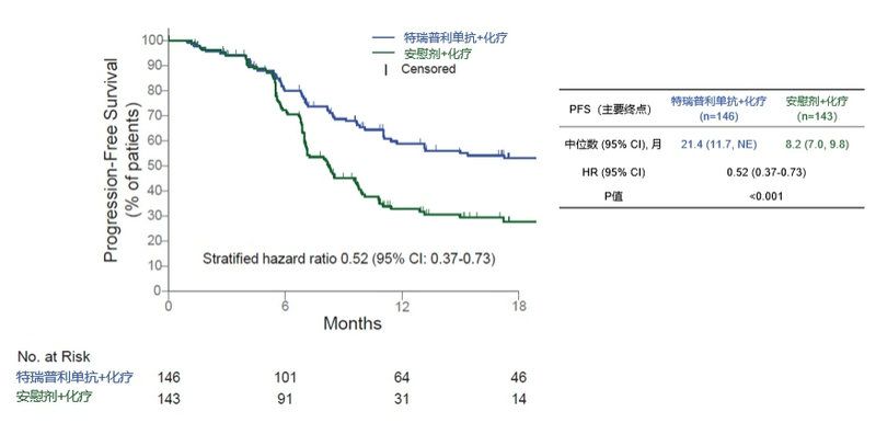 截至2021年6月8日,特瑞普利單抗聯(lián)合化療組較安慰劑聯(lián)合化療組的客觀緩解率有所提升,分別為78.8% vs. 67.1%;尤其是,特瑞普利單抗組的完全緩解率是單純化療的2倍(26.7% vs. 13.3%)。