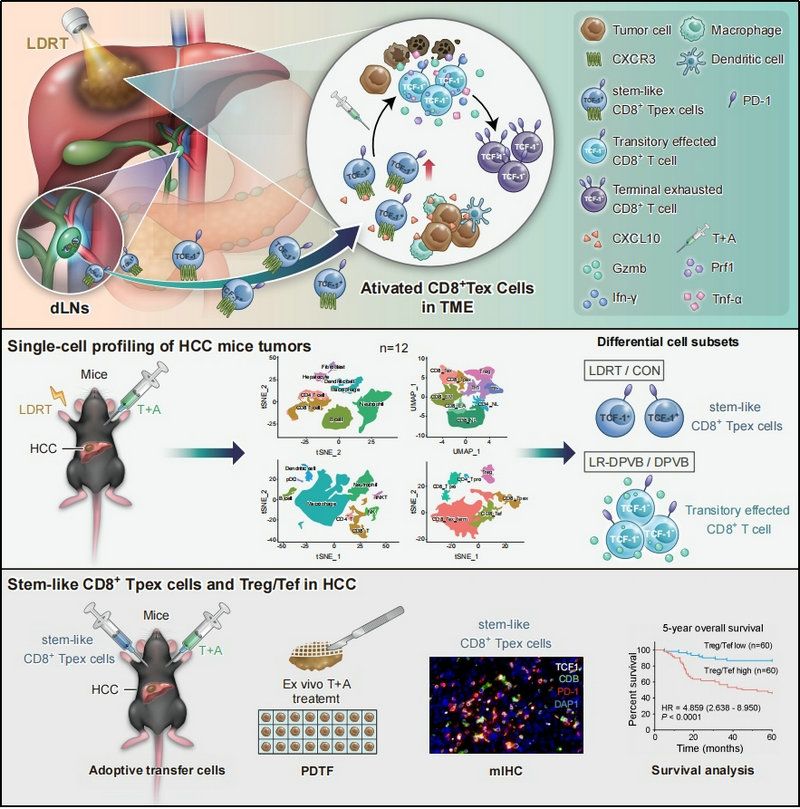 本研究在多種臨床前肝癌模型中發(fā)現(xiàn)低劑量放療(Low-dose Radiotherapy, LDRT)可以明顯增強(qiáng)雙重程序性細(xì)胞死亡配體-1 (Programmed cell death 1 ligand 1,PD-L1) 和血管內(nèi)皮生長因子A (Vascular endothelial growth factor A, VEGFA) 阻斷 (Dual PD-L1 and VEGFA Blockade, DPVB) 的抗腫瘤作用。該聯(lián)合治療顯示出顯著的CD8+ T細(xì)胞介導(dǎo)的抗腫瘤治療療效。高通量單細(xì)胞RNA測序和多種實驗結(jié)果顯示,LDRT聯(lián)合DPVB增強(qiáng)了腫瘤排斥的耗竭樣CD8+ Tex的效應(yīng)功能和細(xì)胞毒性。此外,利用多個肝癌臨床前模型和體外腫瘤片段平臺(Patient-derived tumor fragments, PDTFs) 進(jìn)行療效機(jī)制深入研究,結(jié)果表明LDRT通過CXCL10/CXCR3軸促進(jìn)干細(xì)胞樣祖耗竭性CD8+ Tpex從引流淋巴結(jié)向瘤內(nèi)募集進(jìn)而增敏DPVB的機(jī)制。該研究對于提高不可切除肝細(xì)胞癌的聯(lián)合治療療效提供了可靠的臨床前證據(jù)。