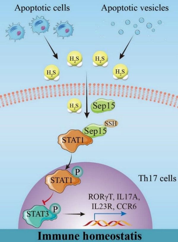此研究利用細(xì)胞凋亡缺陷的MRL/lpr和Bim-/-小鼠模型發(fā)現(xiàn),細(xì)胞凋亡缺陷引起機(jī)體多器官硫化氫水平的降低,后者與Th17細(xì)胞異常分化造成的器官炎癥性損傷相關(guān)。化學(xué)性凋亡誘導(dǎo)可上調(diào)硫化氫水平,緩解凋亡缺陷小鼠的器官損傷并改善免疫功能,從而證實(shí)細(xì)胞凋亡是機(jī)體硫化氫氣體分子的重要來源。機(jī)制上,構(gòu)建硫化氫介導(dǎo)的巰基化修飾Th17細(xì)胞蛋白組學(xué),篩選出下游關(guān)鍵蛋白靶點(diǎn)硒蛋白15(Selenoprotein F,Sep15)以及關(guān)鍵修飾位點(diǎn)C38。通過位點(diǎn)突變技術(shù),硫化氫對(duì)Sep15C38A Th17分化作用減弱。這表明,Sep15C38是硫化氫抑制Th17異常分化的關(guān)鍵靶點(diǎn)和位點(diǎn)。進(jìn)一步通過Co-IP和磷酸化修飾蛋白檢測(cè)發(fā)現(xiàn),Sep15通過調(diào)控STAT1/STAT3蛋白的磷酸化和入核,從而發(fā)揮抑制Th17細(xì)胞分化的作用(圖1)。另外,本項(xiàng)目進(jìn)一步驗(yàn)證了細(xì)胞凋亡具有傳承作用,干細(xì)胞來源的凋亡囊泡中具有自主產(chǎn)生硫化氫的作用,且該作用與其治療紅斑狼瘡的效果密切相關(guān)。