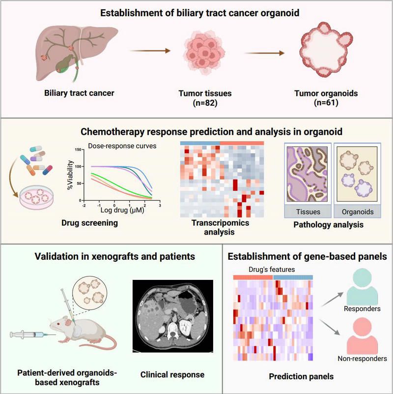 BTC類器官是一種個(gè)性化化療藥物篩選的有效工具,基于BTC類器官的藥物敏感性可以發(fā)現(xiàn)藥物不同反應(yīng)的轉(zhuǎn)錄組學(xué)特征,進(jìn)一步建立化療反應(yīng)預(yù)測(cè)模型,幫助BTC患者選擇有效藥物