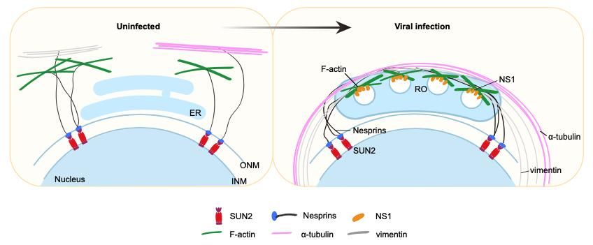 最后,研究人員利用病毒感染的乳鼠模型,證實(shí)SUN2敲除使得寨卡病毒在動(dòng)物體內(nèi)的復(fù)制、傳播和致病力都大大減弱。綜上所述,該論文闡明了核膜蛋白SUN2促病毒的機(jī)制是:SUN2與Nesprins共同作用,促進(jìn)NS1-actin誘導(dǎo)的細(xì)胞骨架重塑和復(fù)制囊泡的形成,調(diào)控黃病毒RNA的合成(圖1)。這也提示除了細(xì)胞質(zhì)骨架,細(xì)胞骨架系統(tǒng)的其它蛋白(如核膜蛋白SUN2和Nesprins)也是黃病毒復(fù)制的關(guān)鍵因子。