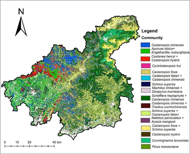 森林是地球陸地上最主要的自然生態(tài)系統(tǒng)類型。森林覆被格局的現(xiàn)狀是歷史過(guò)程的結(jié)果。受自然和人為因素的影響,區(qū)域性的森林景觀及結(jié)構(gòu)總是處于不斷變化的動(dòng)態(tài)過(guò)程。無(wú)論是在全球性還是區(qū)域性的范圍內(nèi),森林覆被的變化與環(huán)境變化之間都存在著復(fù)雜的非線性動(dòng)態(tài)反饋關(guān)系。因此,重建歷史森林景觀的格局,建立長(zhǎng)時(shí)間序列的森林景觀圖譜,對(duì)于研究森林對(duì)生態(tài)環(huán)境的影響及其對(duì)氣候的響應(yīng)機(jī)制具有重要意義。目前國(guó)際上大多數(shù)重構(gòu)研究采用的算法較為簡(jiǎn)單,獲取的空間分布信息分辨率不高,精度驗(yàn)證結(jié)果不甚理想。針對(duì)這一問(wèn)題,余世孝教授課題組聯(lián)合了中國(guó)林業(yè)科學(xué)研究院李意德和周璋研究員、中國(guó)科學(xué)院華南國(guó)家植物園曹洪麟研究員以及華南農(nóng)業(yè)大學(xué)唐光大教授等課題組,在對(duì)廣州市北部地區(qū)森林植被進(jìn)行大范圍調(diào)查的基礎(chǔ)上,結(jié)合遙感判別和聚類分析方法對(duì)該區(qū)域的主要森林群落進(jìn)行劃分,基于氣象因子、地形因子、與各個(gè)土地利用類型的最近距離、回溯起始年份的森林群落空間分布數(shù)據(jù)等要素,結(jié)合AdaBoost算法(用弱分類器的線性組合構(gòu)造強(qiáng)分類器)改進(jìn)的人工神經(jīng)網(wǎng)絡(luò)(Artificial Neural Network,ANN)和自然林地的分布關(guān)系,創(chuàng)建了一個(gè)基于元胞自動(dòng)機(jī)(Cellular Automaton,CA)的空間演化模型來(lái)重建歷史森林的空間格局,使用CA-AdaBoost-ANN對(duì)廣州市北部地區(qū)的2000年和1990年的森林群落進(jìn)行重建(圖1和圖2),且與廣州市北部地區(qū)森林群落的實(shí)際分布有很高的吻合度。研究文章所提出的CA-AdaBoost-ANN模型能揭示外部環(huán)境和演替內(nèi)因驅(qū)動(dòng)下的歷史森林格局,特別是能在種群和群落水平上重建歷史時(shí)期的森林景觀圖譜。研究結(jié)果可為森林經(jīng)營(yíng)管理提供理論依據(jù),也為預(yù)測(cè)未來(lái)森林格局演變提供了有效手段。
